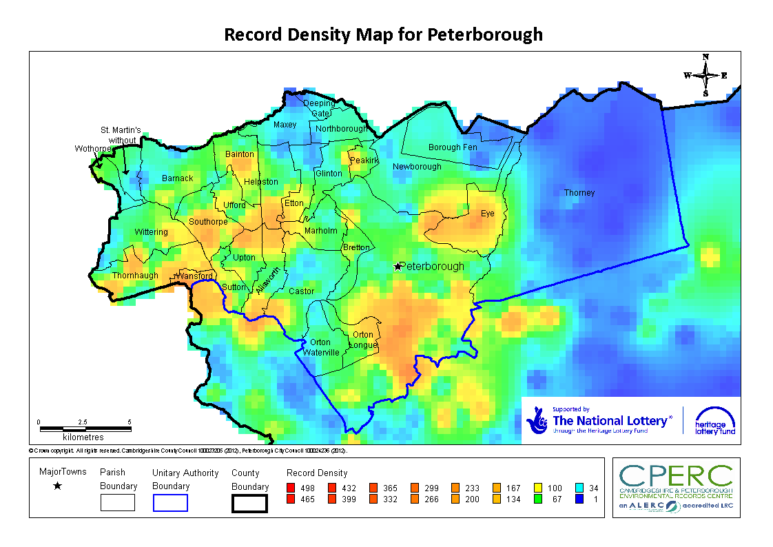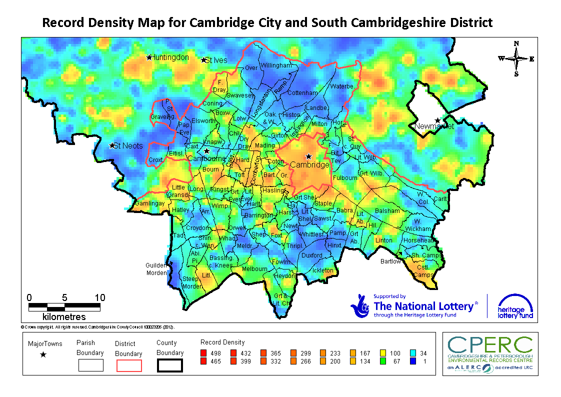 Many recorders and volunteers have helped build up a general picture of Cambridgeshire and Peterborough’s wildlife over the years, however there are still many gaps in this picture. The record density map below shows the number of records that we currently have in our database per square kilometre, for Cambridgeshire and Peterborough.